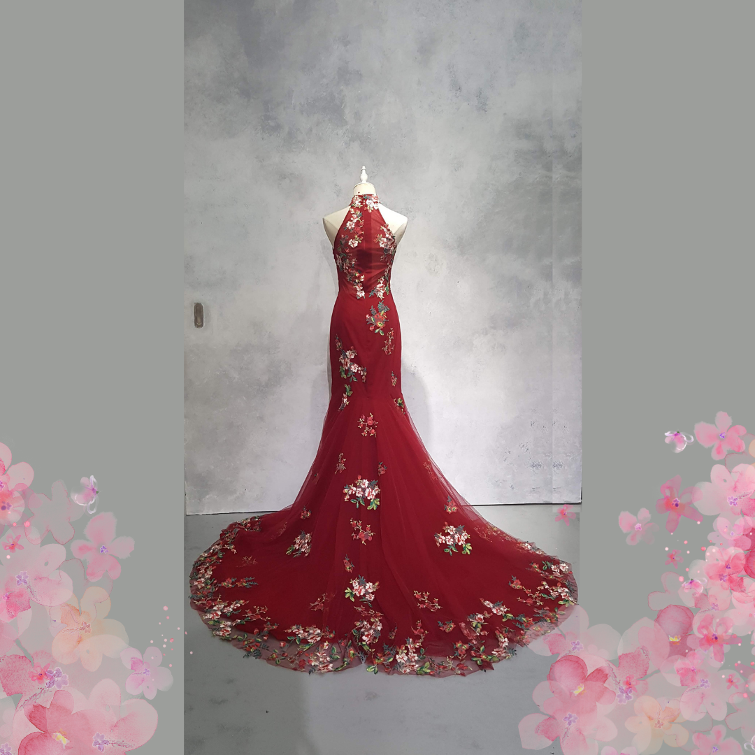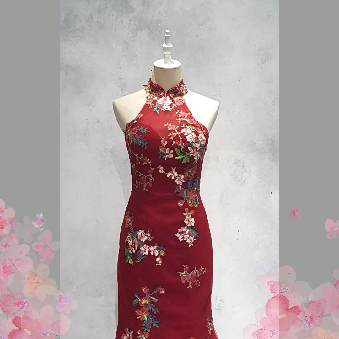 219EL01E03 May Cheong Sam Red Floral Halter 1 Oriental Cheong Sam Qi Pao rental Malaysia Kuala Lumpur Petaling Jaya