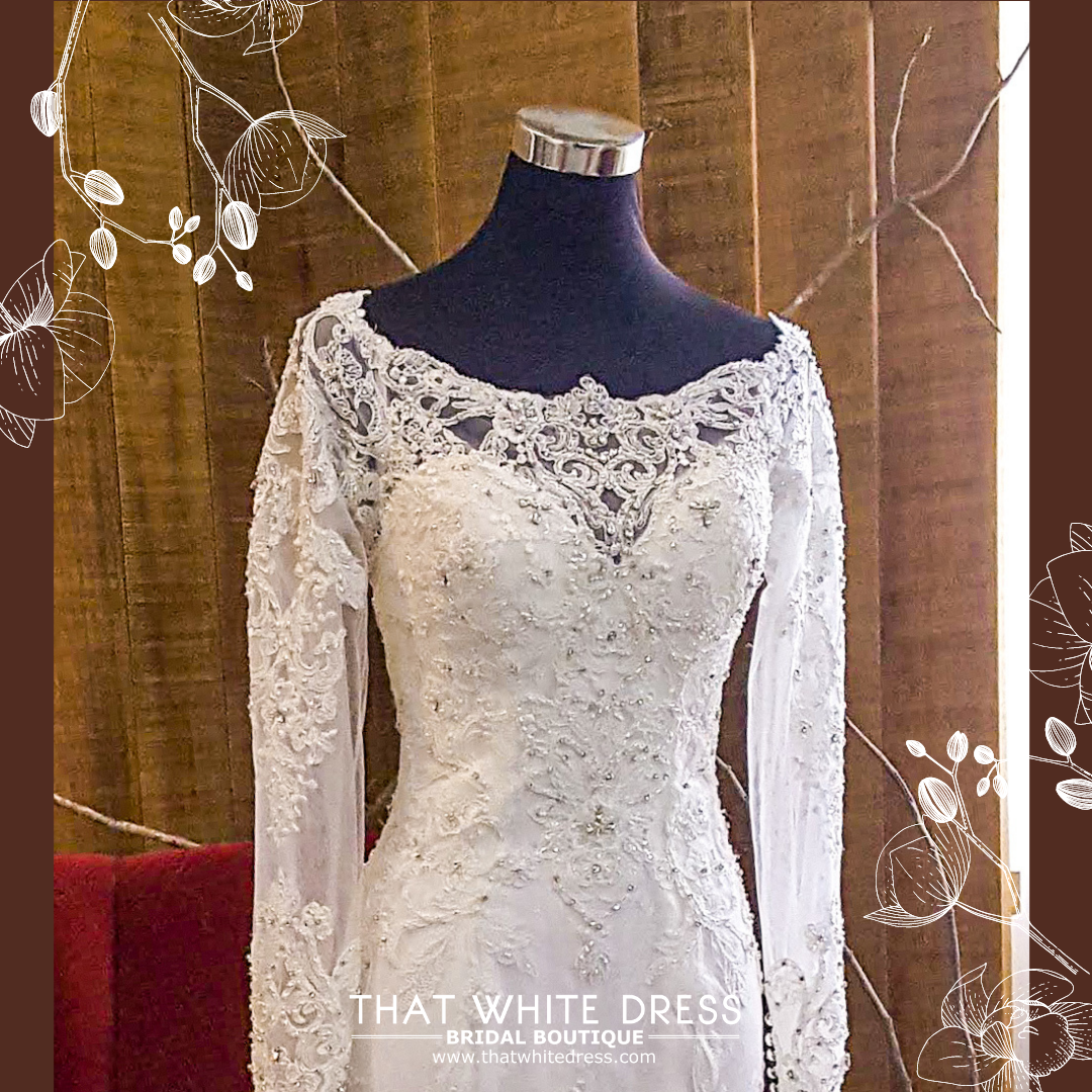 2012BY09W01 Evita Long Sleeves Boat Straight Lace Trumpet Button Back a Gaun Pengantin Muslimah Malaysia sewa Kahwin Nikah