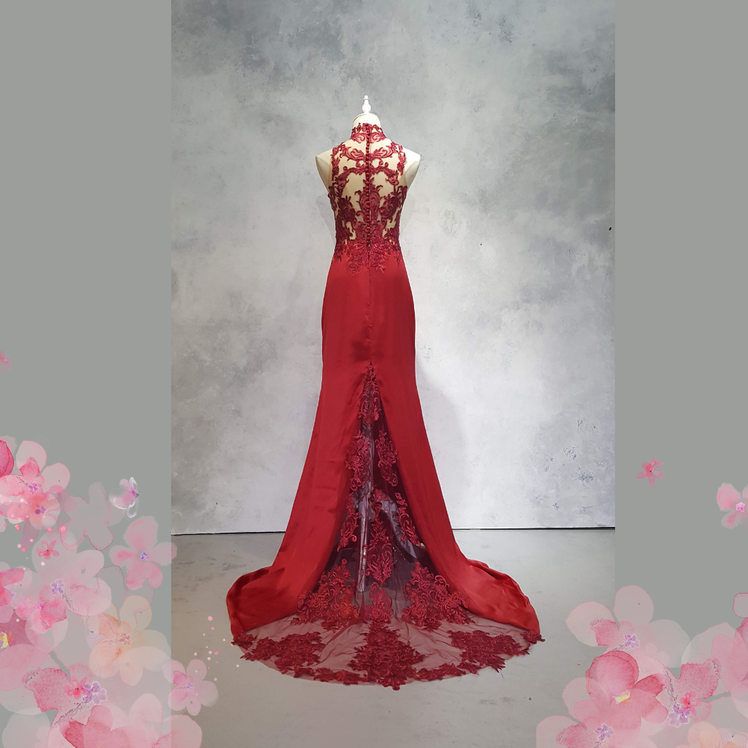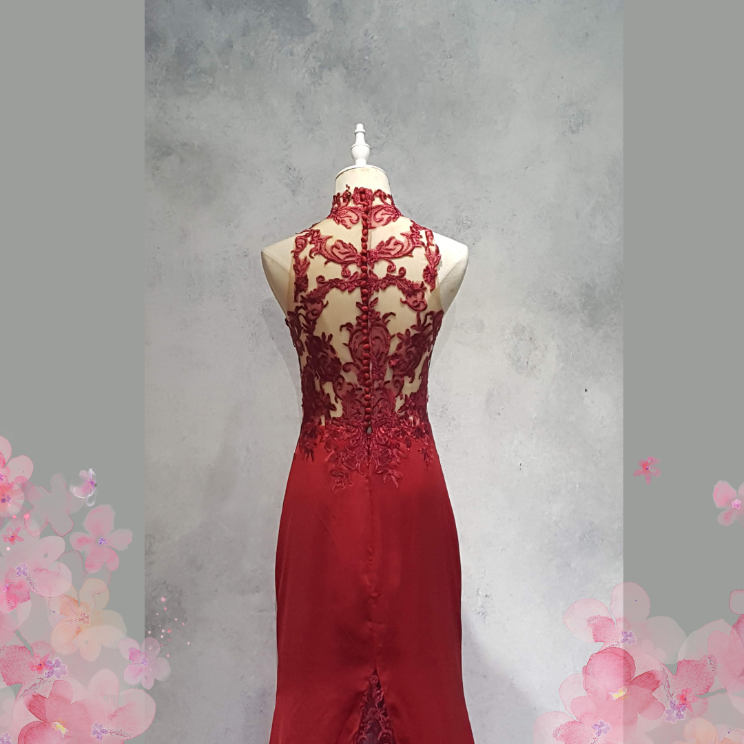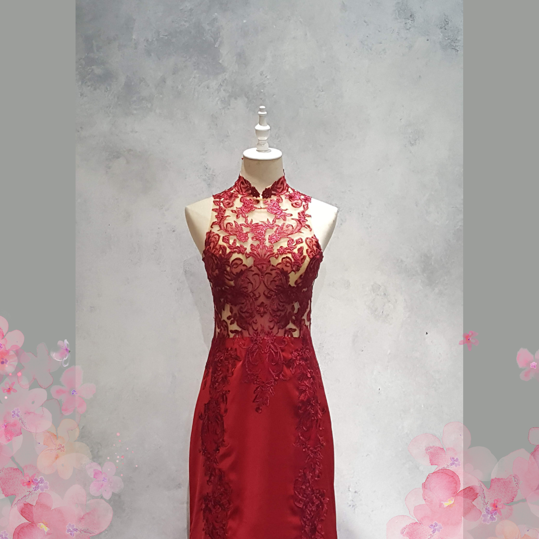 222EL03E01 Berry Cheongsam Pronovias Lace Full red 7 Oriental Cheong Sam Qi Pao rental Malaysia Kuala Lumpur Petaling Jaya