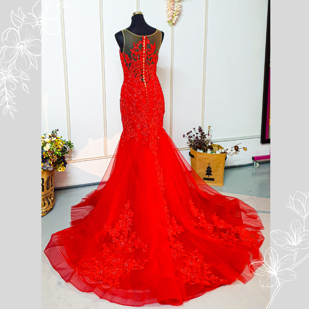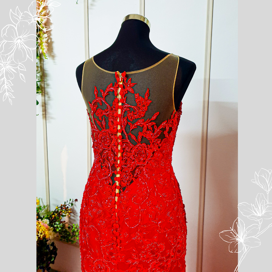 Evening Dress 204LLE02 Maddie Red Illusion Deep V Button Back Trumpet bridal gown wedding rental Malaysia evening reception