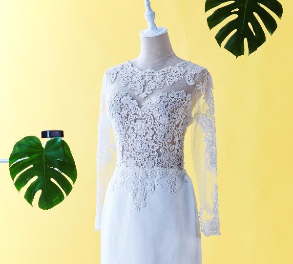 Long sleeves weding dress in elegant A line/Sheath style. Illusion neckline embroidered in Spanish Alencon lace, teamed with luscious soft silk Duchesse satin skirt. Can be accessorized with a sparkling Swarovski crystal and rhinestones belt.