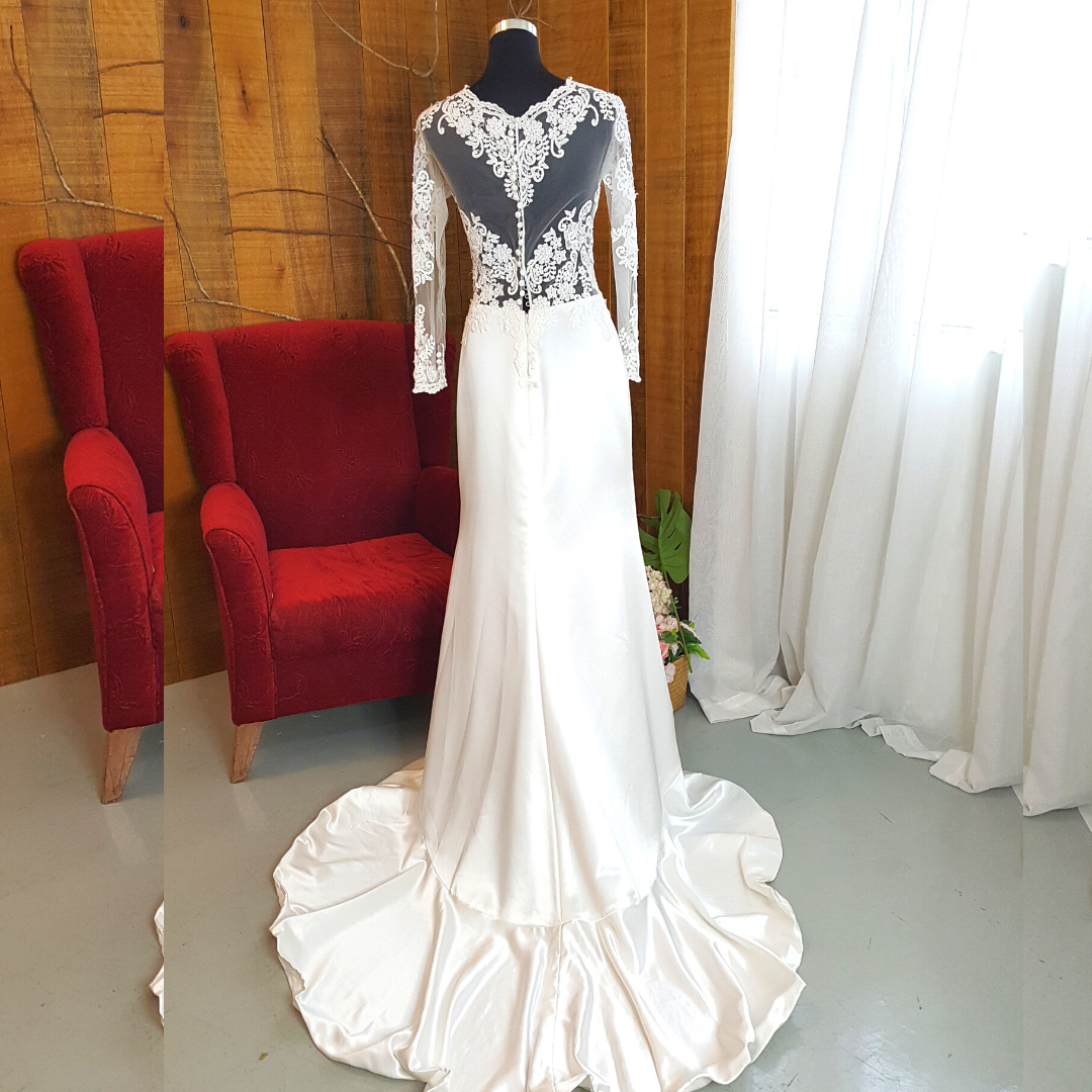 Minimalist Silk Satin couture design long sleeves with beautiful lace neckline.