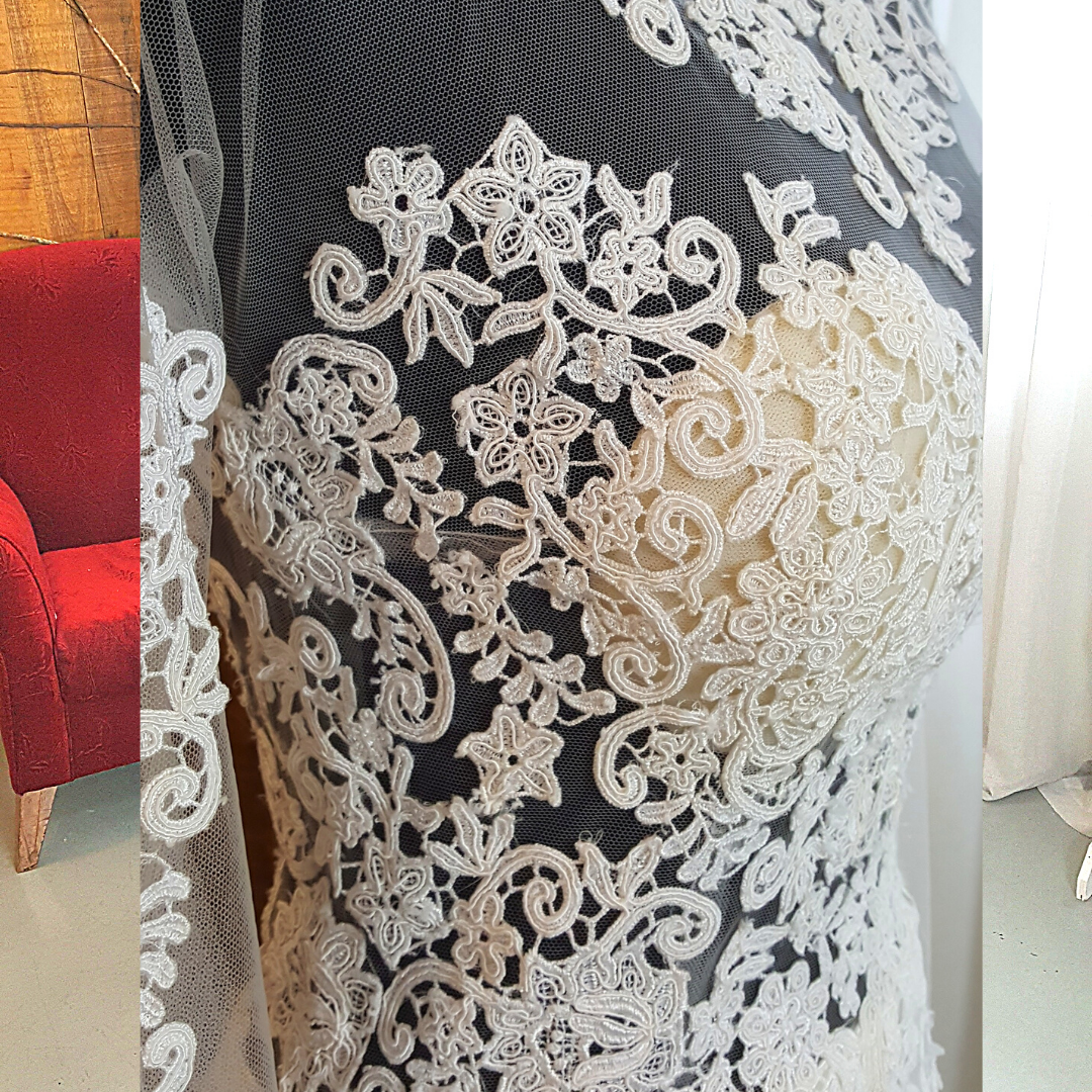 It features a beautiful French Guipure Lace bodice with gorgeous lace embroidery that will guarantee to be the highlight of the wedding reception or registration.