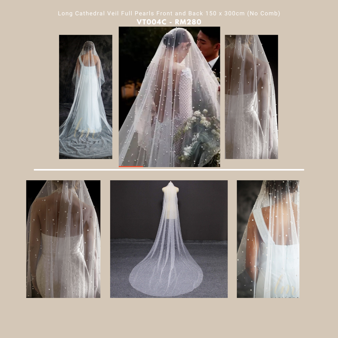 VT004c TWD Premium Bride Wedding Veil Full Pearl Long Cathedral Soft Tulle Net Finger Tip no Comb/Veil Tudung Pengantin Nikah Sanding