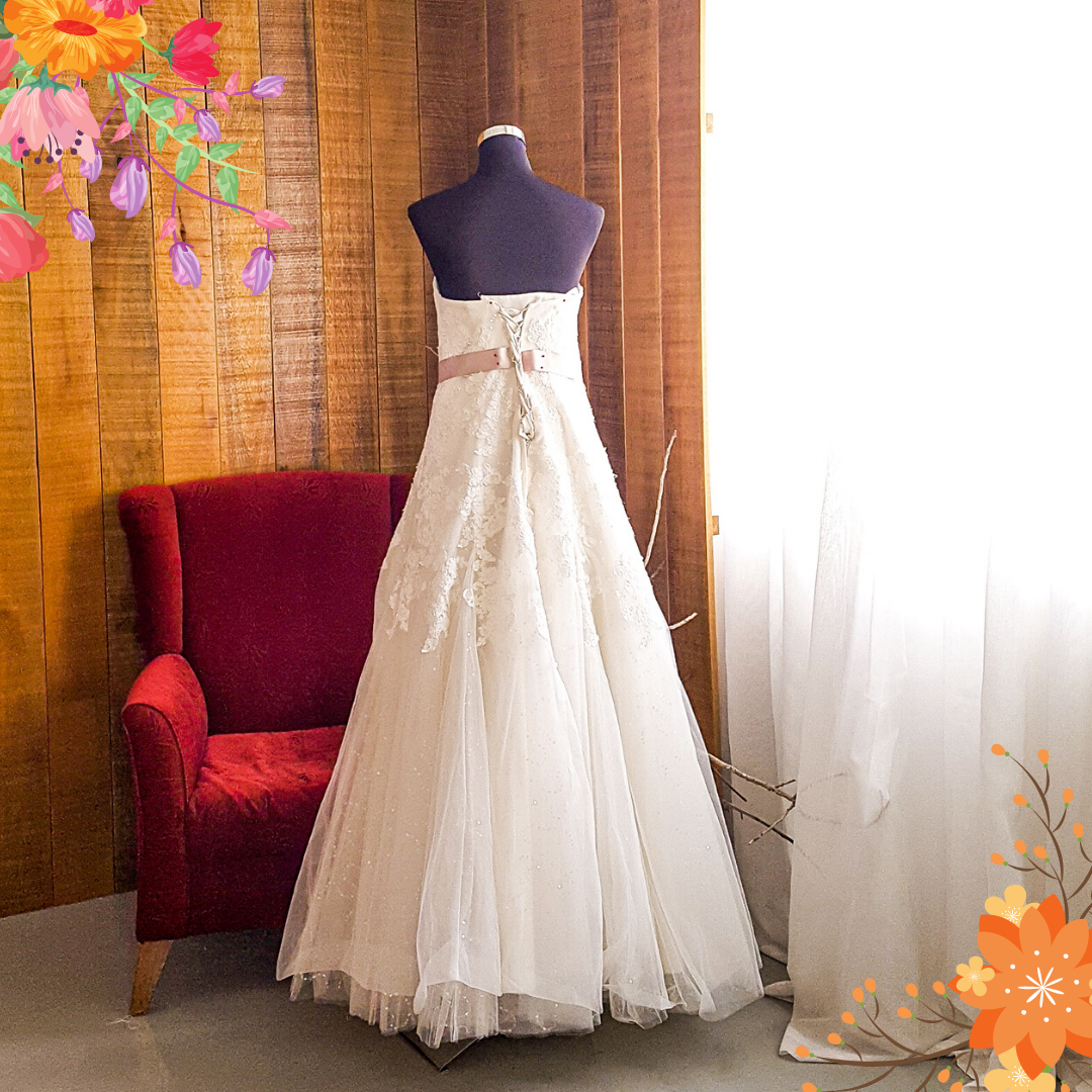 Featuring a beautiful lace embroidery with elegant beading details, this gorgeous wedding dress is both elegant and timeless!