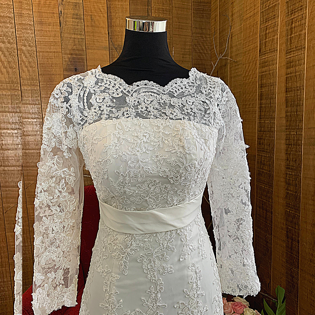 Long sleeves wedding dress with elegant bateau straight boat neck neckline in Full French Alencon Corded lace.