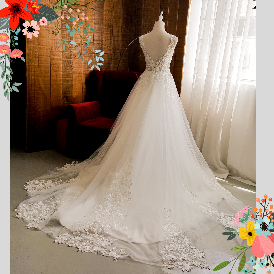 910BY05W02 Barrie Strap V illusion neck A line lace train b Low Back Button Bride Wedding Gown Premium Designer Malaysia rental