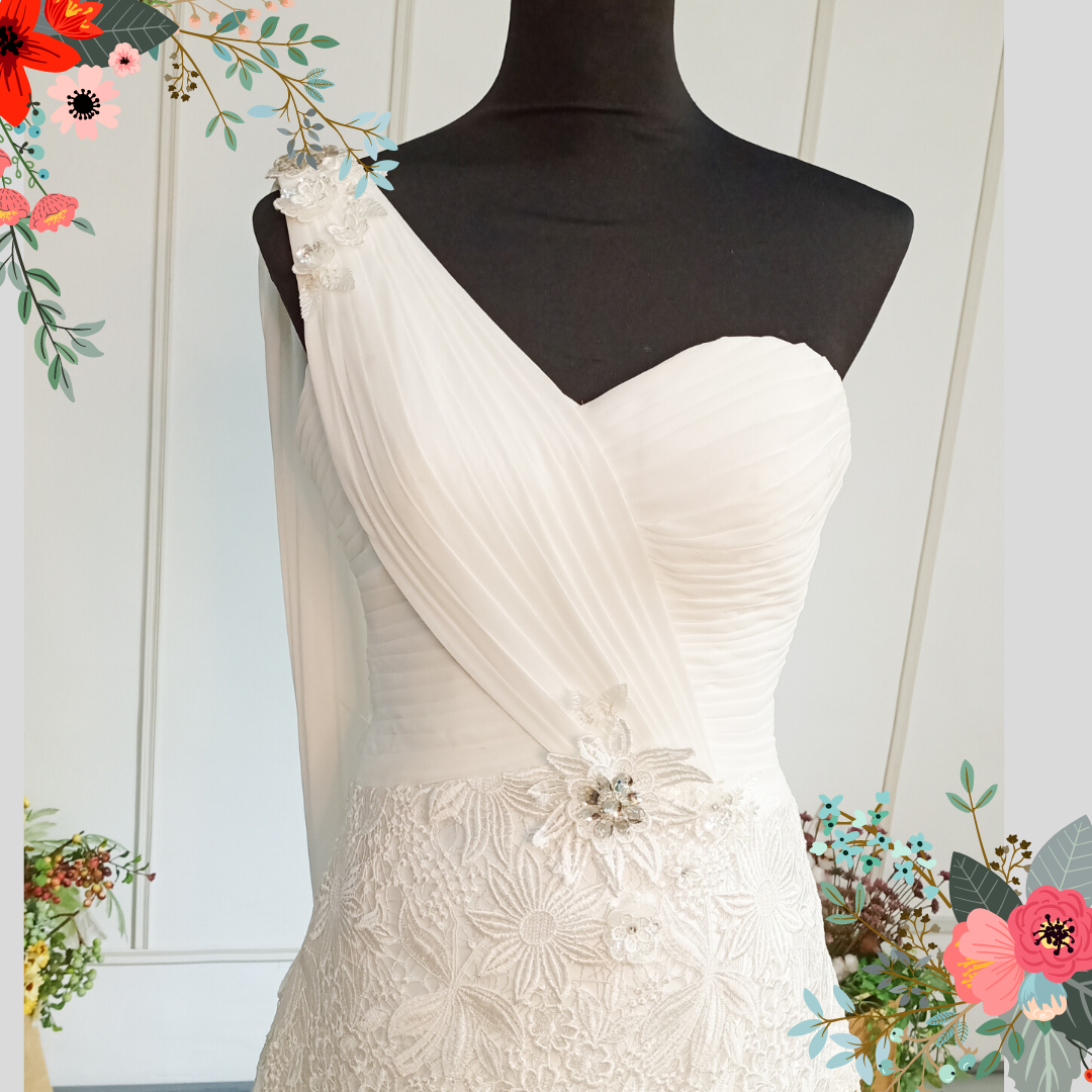408W03 LL One Shoulder 3D French Lace Grecian a Wedding Dress Rental Malaysia