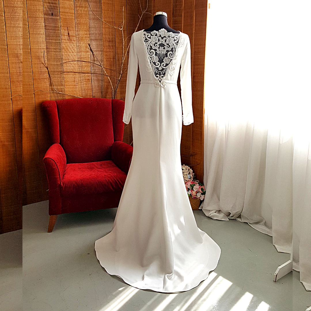 Long sleeves wedding dress in elegant straight cut sheath style. Featuring a sexy low V back look or can be converted into a covered lace back look.