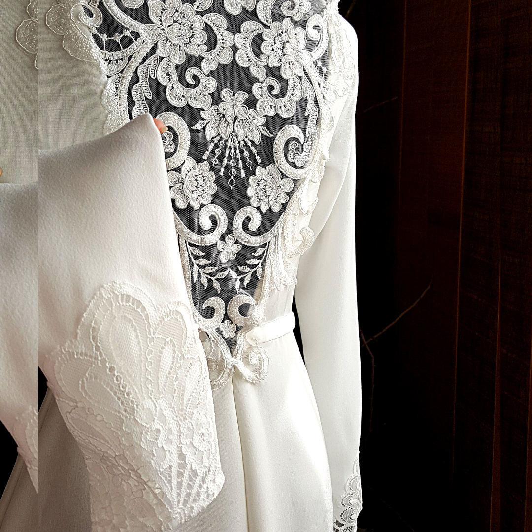 Can be teamed with a detachable long sleeves inner garment to convert it into a conservative covered back dress suitable for church wedding, muslimah wedding/majlis perkahwinan, or nikah.