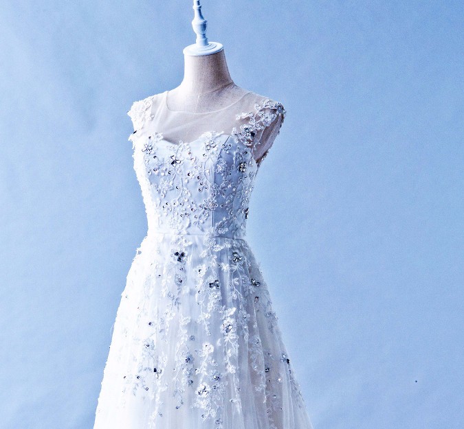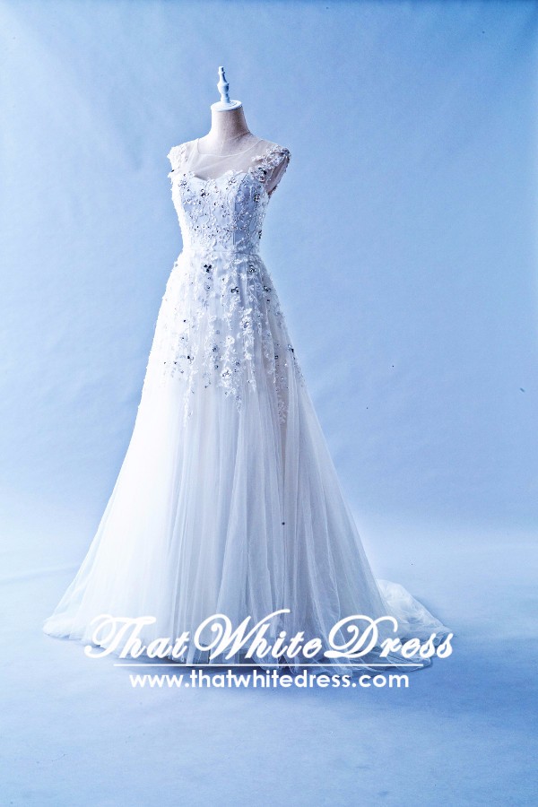 Illusion neckline wedding dress in A line flare skirt, embellished with Swarovski rhinestones and crystal beadings. Can be accessorised with a crystal studded belt or bolero.