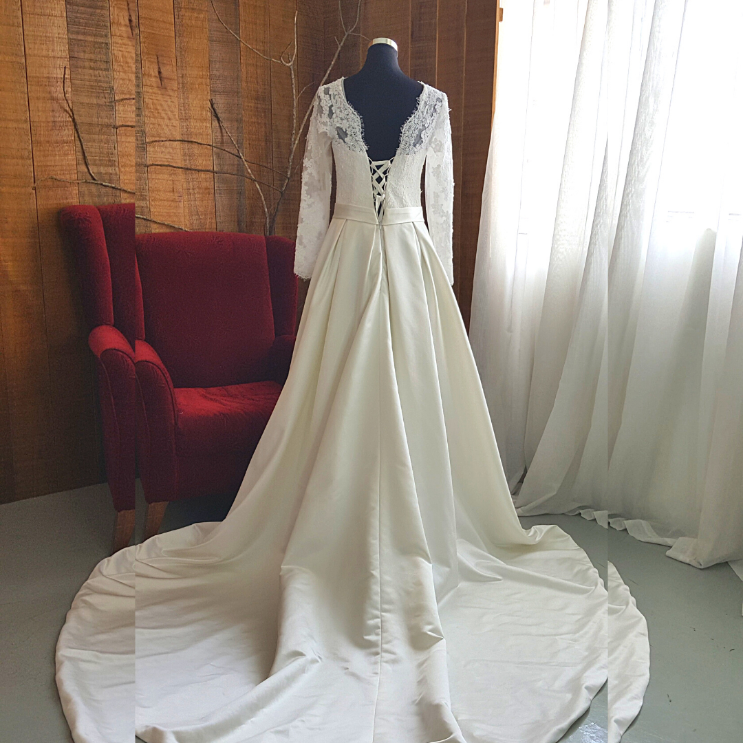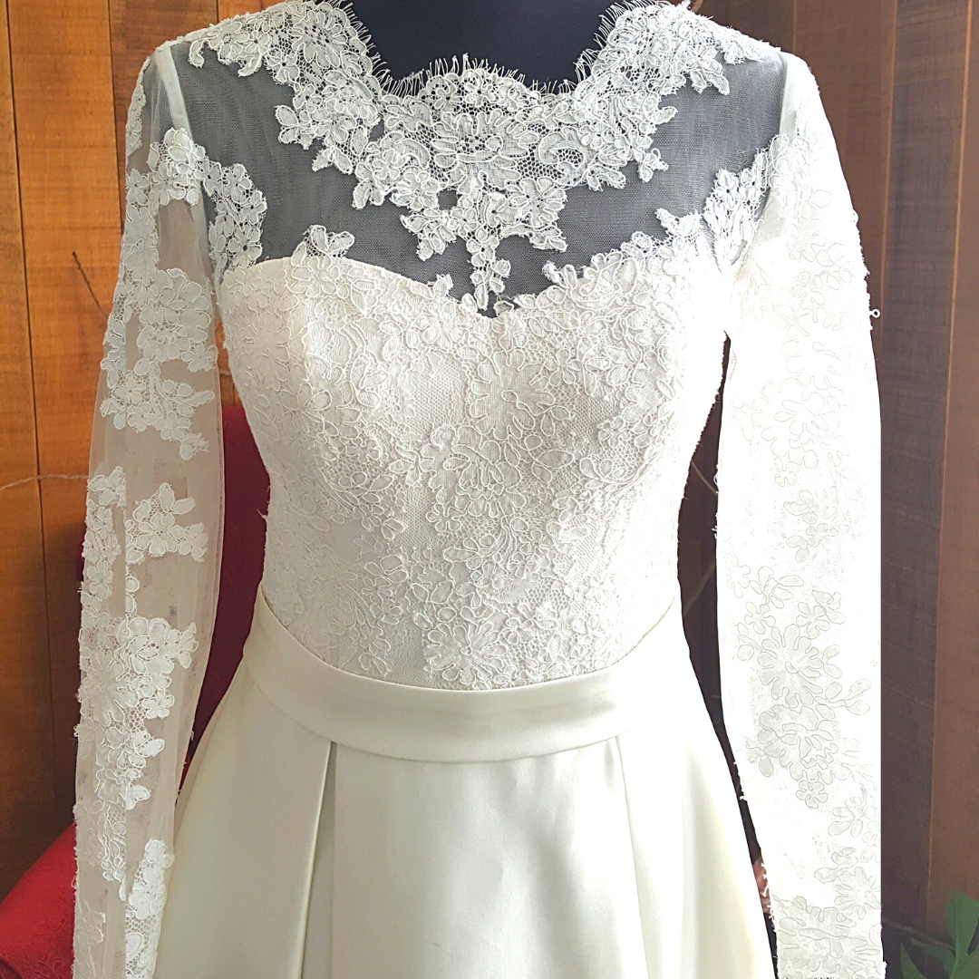 Couture design long sleeves wedding dress in A line featuring lush Duchess Satin Skirt.