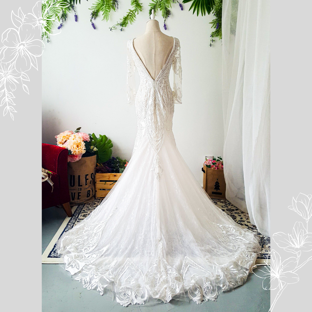 71LLW02 LL Long Sleeves Geometry Trumpet Low V back a Kahwin Pengantin Nikah Sanding Malaysia Wedding Dress