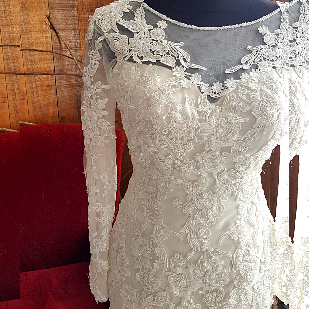 Long sleeves wedding dress in elegant mermaid/trumpet style. Featuring beautiful French embroidered floral lace with swarovski crystals.