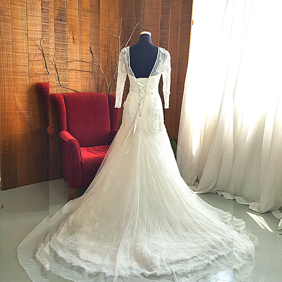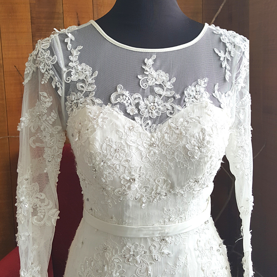 Couture design long sleeves wedding dress in trumpet cut in elegant French Chantilly lace with Italian lace embroidery.