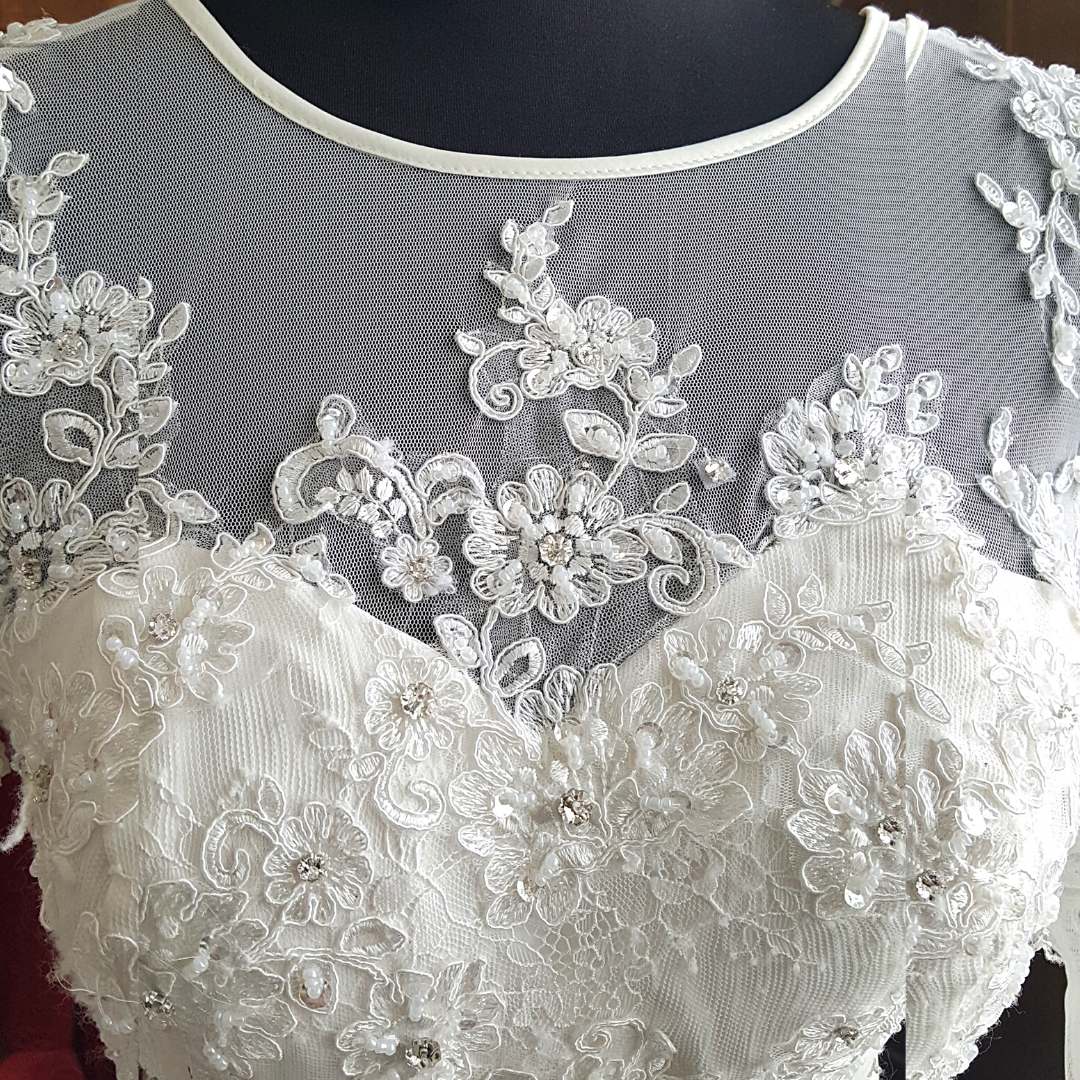 It features a beautiful illusion neckline with gorgeous lace embroidery that will guarantee to be the highlight of the wedding reception or registration.