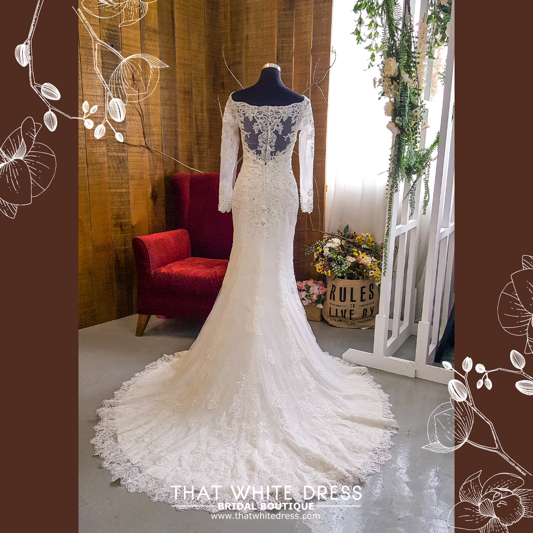 2012BY09W01 Evita Long Sleeves Boat Straight Lace Trumpet Button Back a Gaun Pengantin Muslimah Malaysia sewa Kahwin Nikah