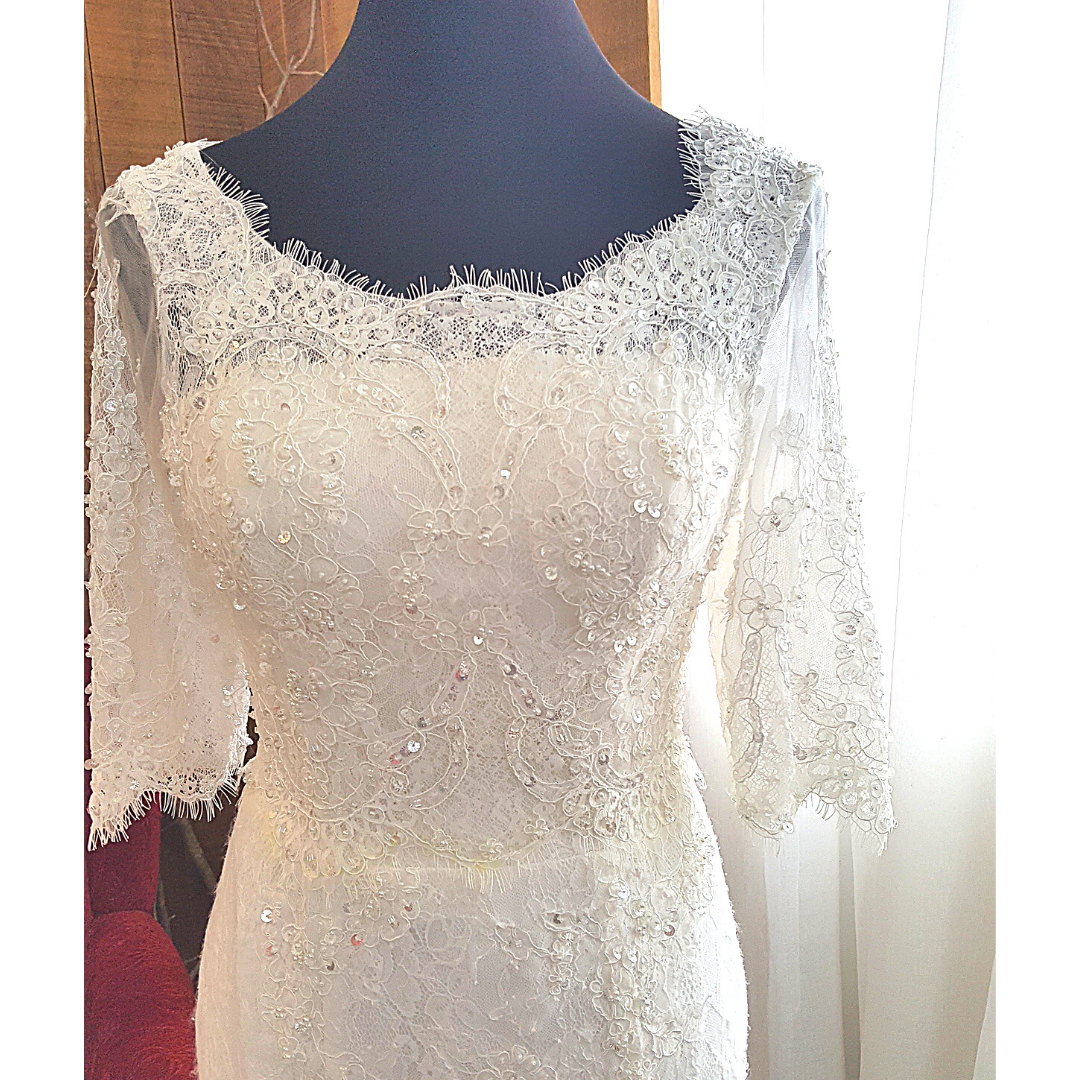 Couture design long sleeves boat neck wedding dress in trumpet style with gorgeous full Chantilly lace.